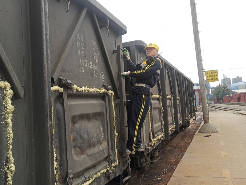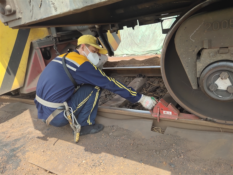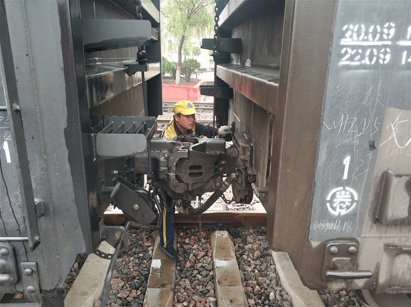 空旷的站场,股道密集,车辆穿梭,取送车时都要仔细对存车进行复检,车辆状况如何,停留位置在哪里等情况,调车员都要与连接员一一核对清楚,确定无一疏漏后指示机车停留位置,人力紧固器、提挂车钩、摘连风管、开闭折角塞门、放好撤除防溜铁鞋……任何一项作业都要严格操作,标准实施。