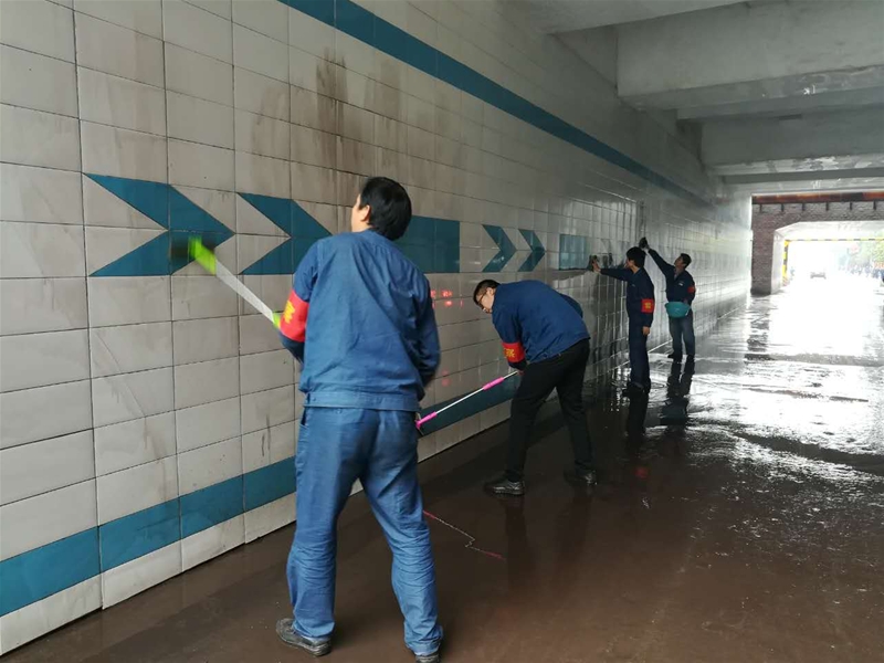 10点50分,志愿者们带着抹布、水盆等清洁工具准时在党群工作部门前进行集合。在经过了简短的动员后,随着带队领导一声“出发”令下,志愿者们迈着整齐的步伐,雄赳赳气昂昂地奔赴 “战场”,准备大干一场,让涵洞墙壁换新颜。