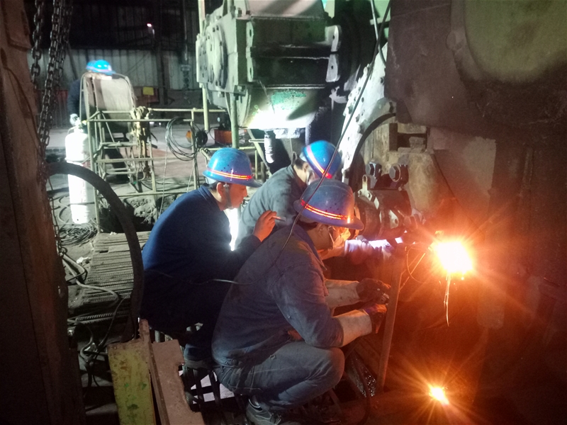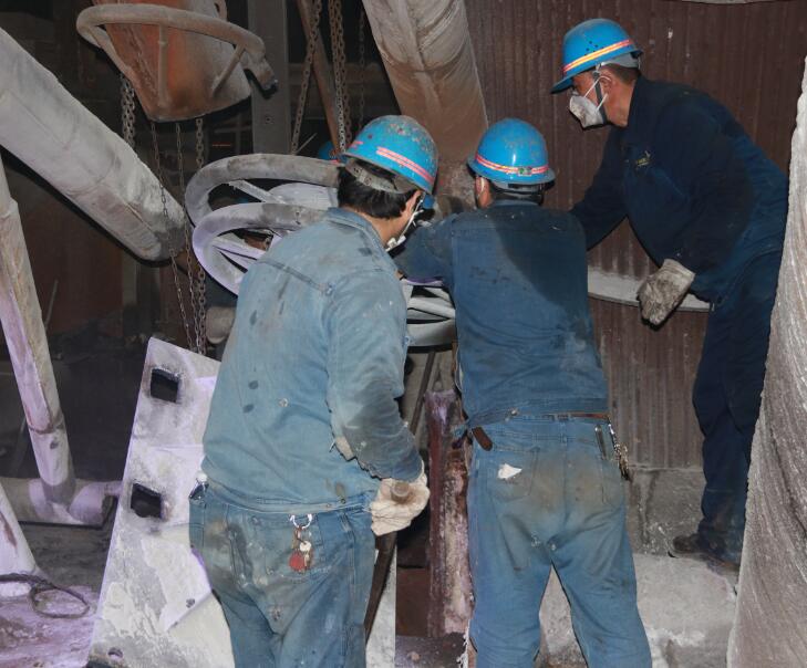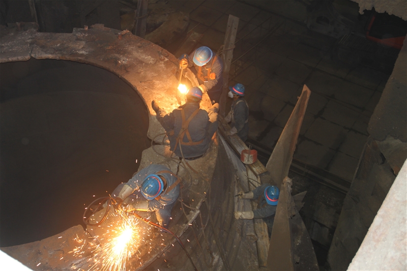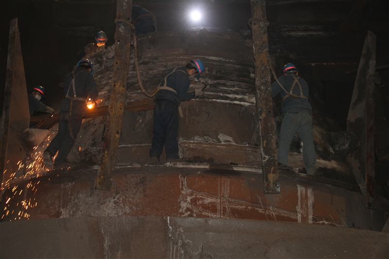 他们刚一停下来,两名维修工立刻上到炉体进行焊接作业。由于停炉时间不长,炉体上的温度高达七八十度,一般的鞋上去鞋底都会被烤化,他们站在上面要不断地跺脚,防止鞋底被烤化。不光是这个,站在上面,炉体上的高温逼得他们快喘不过气来,干一会就要下来喘口气。就这样,一波又一波,直到作业全部结束,他们的脸上才露出开心的笑容。