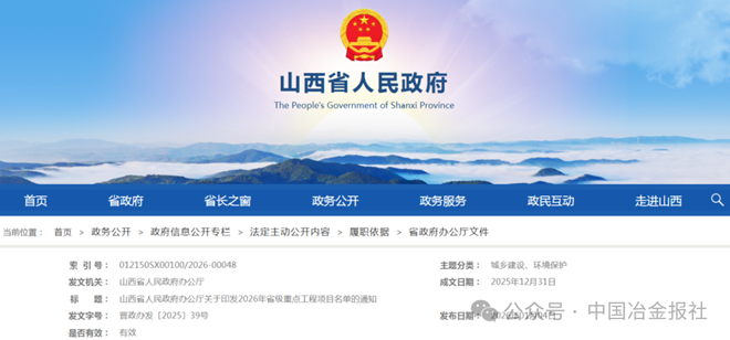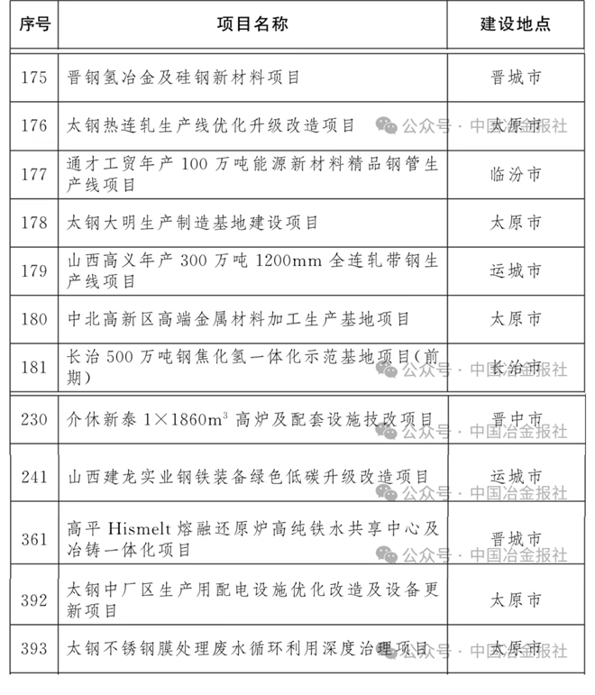 近日,山西省人民政府办公厅印发2026年省级重点工程项目名单,其中钢铁相关项目整理如下——