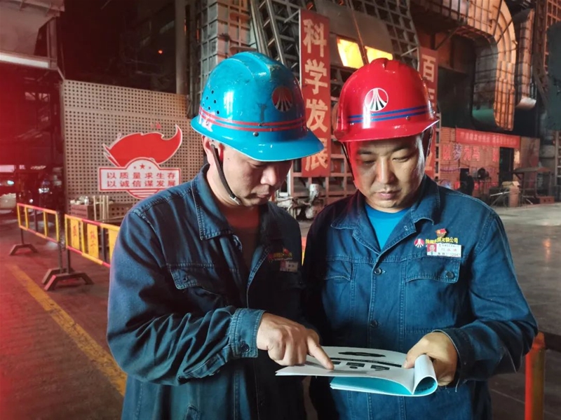 “解工,利用明天检修,咱们对6#炉渣跨轨道变形问题进行改造,你提前把备件准备好。”“已经准备妥当。”在转炉新区平台上,转炉作业区党支部书记刘永清和安检员解宁宁正在交流常用设备更换问题。