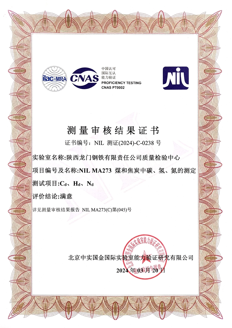 近日,从北京中实国金国际实验室能力验证研究有限公司获悉,龙钢公司参加的中国合格评定国家认可委员会(CNAS)组织的2024年煤和焦炭中碳、氢、氮元素测量审核获得满意结果,检测准确度符合国际互认要求。