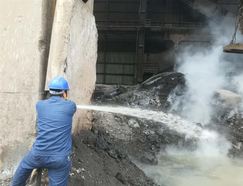 跨内及时对作业工艺进行更改,从推渣、刨渣到出渣,每一个环节都有管理人员现场管控,每一个作业动作都有人员监督、洒水,对新、老渣跨实行湿化作业不松懈。同时,及时对洒水进行调整,红渣用一类水洒湿后再用滤液水焖渣,即保证了滤液水的消化量又确保了焖渣洒水不起尘的。其次,对渣钢取渣实行严格管控,专人监督,严禁挖机、铲车取选干渣,对钢渣垃圾进行统一处理,严禁混入红渣焚烧。