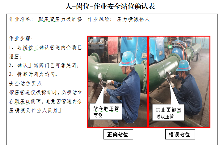 为进一步强化现场作业人员安全风险辨识能力,切实提高员工安全意识,有效杜绝员工习惯性违章及不安全行为,不断减少和消除各类事故的发生,戮力打造“危险预知,风险在控,伤害为零”的安全本质型员工,进入6月份该单位由各作业区牵头,组织区域管理人员及部分一线员工进行讨论,以区域各岗位标准化作业及员工日常作业项目为内容,筛选出涉及人员作业站位安全的相关作业活动,对作业活动中涉及到安全站位的相关步骤,按照“一表一步骤”的要求,同时对相同站位的进行整合,制作各作业活动人-岗-作业活动安全确认表,发至各班组进行学习规范。目前,共汇总规范各类“人-岗-站位”90余项,均已下发至班组进行落实执行。此项措施的执行让员工在标准化作业的同时明确个人安全站位,“双重”保障个人安全,从源头上有效遏制了事故的发生。
