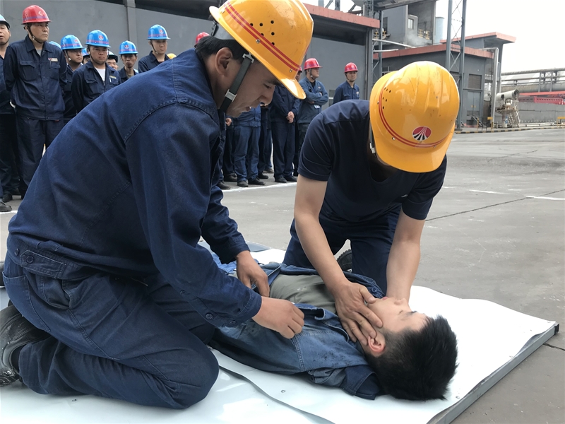 “报告,布袋区域共有两人中毒,一人在箱体灰仓里,一人已救援至箱体外,正在组织救援。”“报告,中毒人员已救援至安全区域。”“报告,煤气泄露原因是灰仓下方卸灰球阀处未插盲板,现已将盲板安插到位。”随着演练紧张而有序的开展,中毒人员全部转危为安,现场煤气漏点得到有效封堵。“大家注意到没有,在楼梯上救人时,要采用单人肩扛式将人员扛到楼梯口,再两人采用双人拉车式,将中毒人员救至安全位置后,解开皮带,松开领扣,采取胸外挤压法进行紧急施救。”安全环保科科长杨军荣对此次演练中特别容易出现的问题做出了示范。