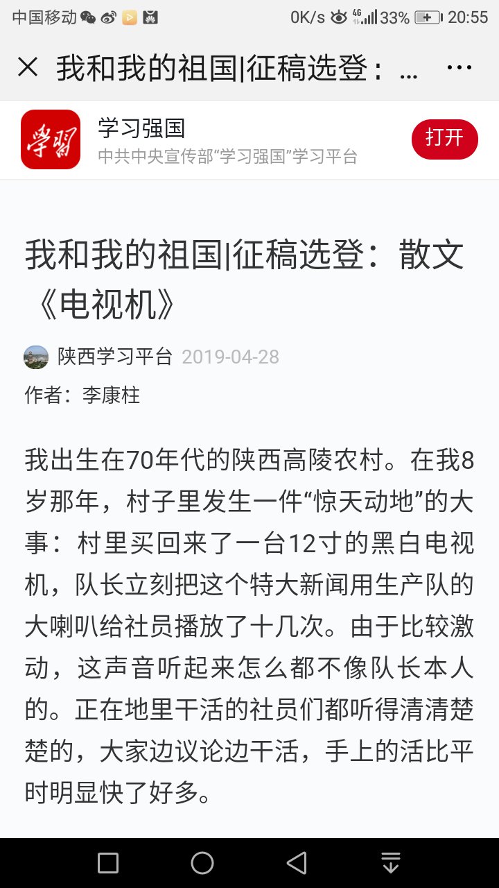 4月28日,当大家正在浏览学习强国中,突然发现一篇我和我的祖国征文---《电视机》被刊载,作者的是陕钢龙钢公司规划发展部职工李康柱。李康柱的文章被学习强国刊载在龙钢公司党员职工中引起热议。大家纷纷向李康柱打来电话表示祝贺,你的文章学习强国刊载了!