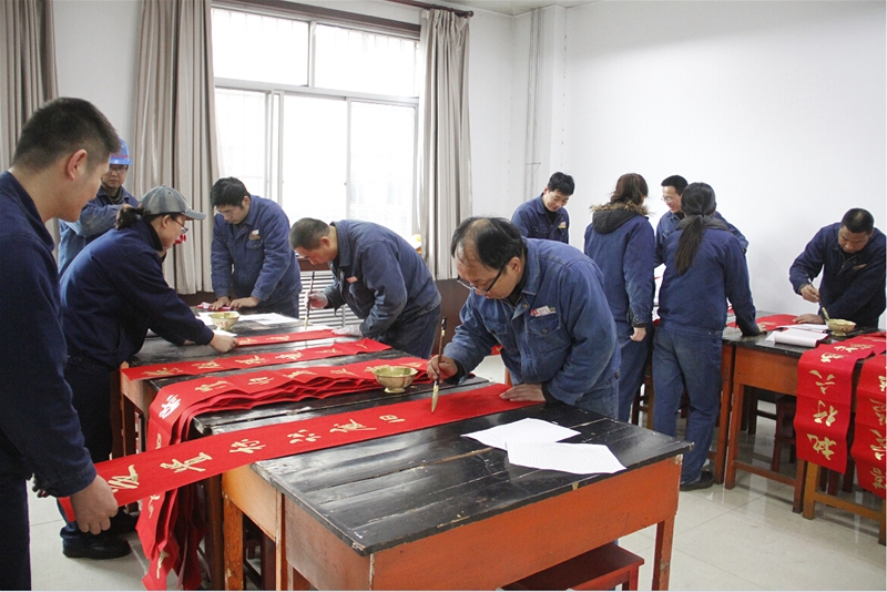 此次活动为期2天,分厂分别购买了红纸、笔墨、金粉、汽油、清漆,并下载经典对联,由专人进行裁纸,供员工挑选使用。