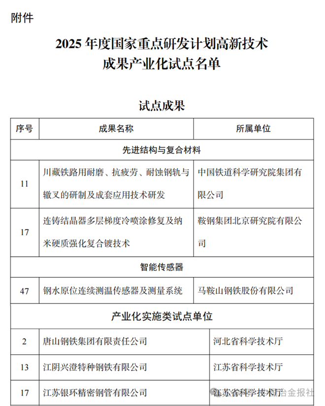 多个钢铁相关成果与单位入选国家高新技术成果产业化试点名单