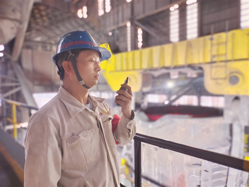 自“一罐制”启动以来,个别铁水罐因渣大导致兑铁不好控制,丁博便将此作为重点进行攻关。他通过对讲机与天车工沟通,着手准备进行钩渣处理,并向当班调度汇报铁水罐异常情况。在丁博的指挥下,天车工经过一番稳而准的操作,粘渣被顺利钩落。通廊上热浪滚滚,铁水蒸腾的气焰让人感到窒息。为确保“一罐制”安全顺行,丁博克服迎面扑来的铁水罐“烤”验,及时处理渣块,安全帽下,汗水不停顺着他通红的脸庞流下,工作服很快就被汗水浸透,但他并没有停下忙碌的脚步,依然全力攻关,护航每一罐铁水。他就是与罐为伍的“守铁人”。
