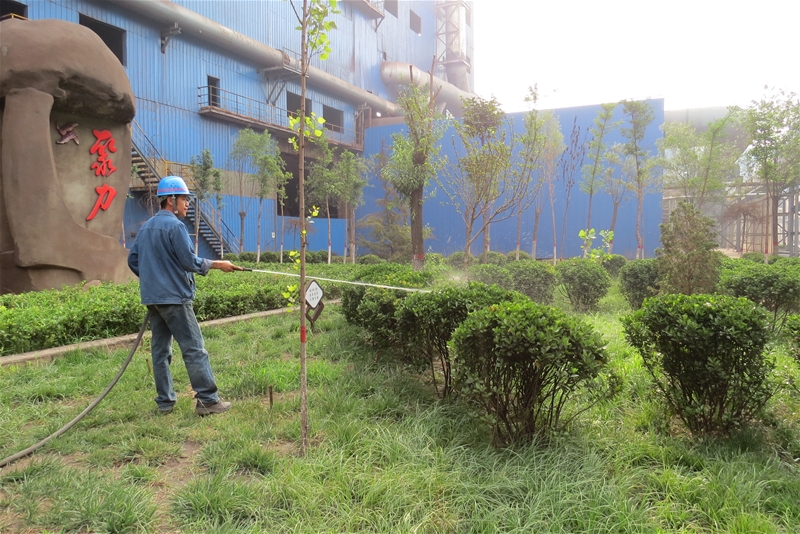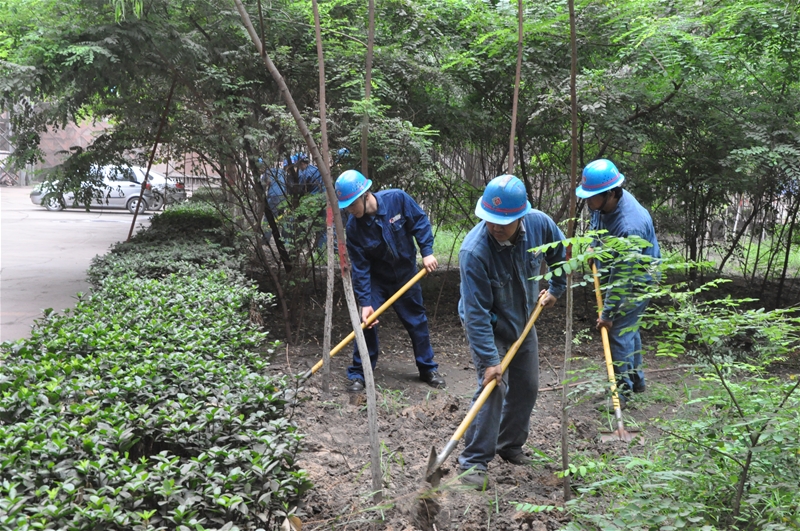 大胆成立绿化管护队,专职管护绿植。针对该厂绿化面积广的现状,大胆创新,成立仅有7人的绿化管护队,对厂区绿化带杂物每天分时间段捡拾两次并保洁,对厂区主干道绿化带浇灌并冲洗叶面一次,每周对外围绿化带进行深翻、浇灌两次;每季度对冬青、树木进行修剪,同时做好适时、适度追肥工作。七人的工作可谓艰巨啊!