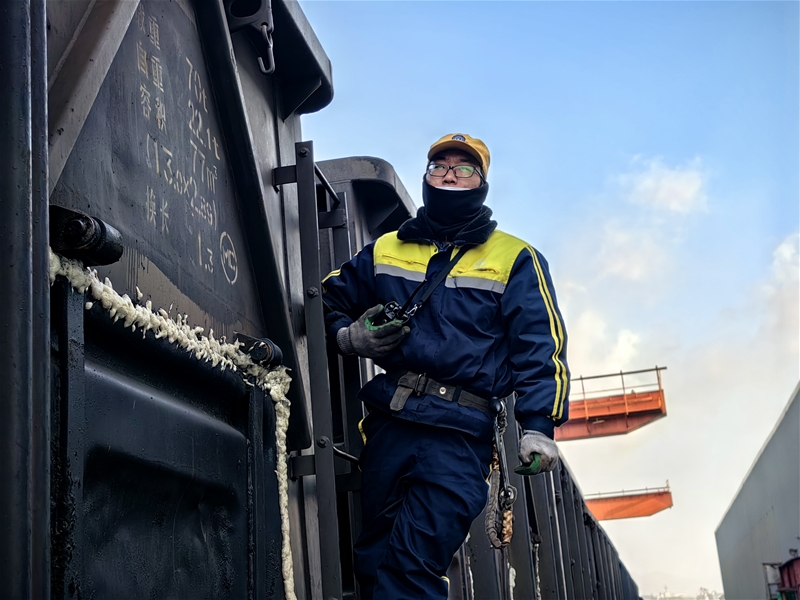 调车员,作为列车运行的“指挥员”,常年在铁运线上奔波作业,腊月的严寒对他们而言,更是一场严峻的考验。“调车作业差之毫厘,谬以千里,再冷也得把每个动作做到位。”调车员小薛手持对讲机,对着话筒清晰下达每一项作业指令。站在冰冷的列车上,寒风毫无遮挡地肆虐,调车员们眼神锐利地观察着列车的动态,挂钩、摘钩、连挂车厢,每一个动作都规范标准、干净利落。长时间在寒风中站立,他们的耳朵、脸颊被冻得发紫,但他们始终坚守岗位准则,严格按照操作规程作业,全力以赴确保每一次调车都高效、顺畅。
