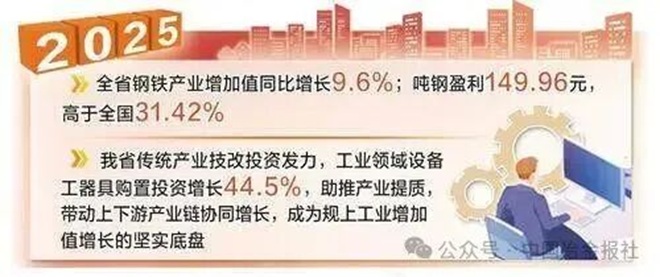 河北省依托科技创新,加快推动钢铁产品由原料级向材料级转变、企业由制造商向综合服务商转型,“河北造”电工钢、汽车板、造船板、特型钢等高端产品层出不穷。“铁疙瘩”变成“金娃娃”,让钢铁提了身价,也为汽车、智能制造等下游产业添了底气。2025年,全省钢铁产业增加值同比增长9.6%;吨钢盈利149.96元,高于全国31.42%。