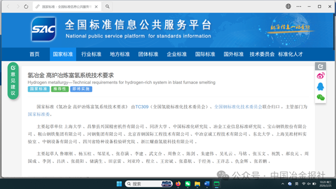 近日,国家标准《氢冶金 高炉冶炼富氢系统技术要求》(标准号:GB/T 47039-2026)在全国标准信息公共服务平台发布,实施日期为2026年5月1日。该标准为首次发布,归口单位为全国氢能标准化技术委员会和全国钢标准化技术委员会,主要起草单位:上海大学、昌黎县兴国精密机件有限公司、同济大学、中国标准化研究院、冶金工业信息标准研究院、宝山钢铁股份有限公司、鞍山钢铁集团有限公司、河钢集团有限公司、北京首钢国际工程技术有限公司、中冶京诚工程技术有限公司、东北大学、上海吴淞材料实验室、中钢设备有限公司、四川省特种设备检验研究院、浙江耀鼎氢能科技有限公司。