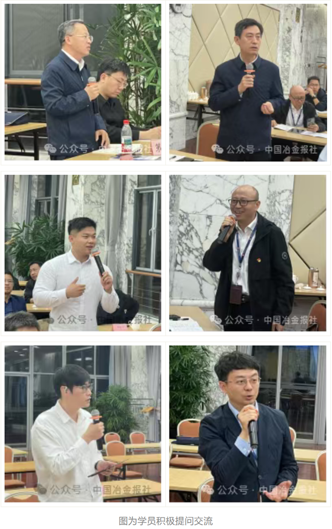 丁立国的精彩报告引起学员的热烈反响。在交流环节,丁立国就钢企国际化发展、“十五五”时期钢铁市场研判、民营钢铁企业的发展路径等问题,与学员进行了互动。第一代创业者对钢铁工业的热爱与投入、付出的艰辛与努力,让学员们深受感动、备受鼓舞。学员们纷纷表示,虽然经历了无数困难与挑战,前辈们依然凭借坚定信念、正确抉择、不懈追求,奠定了中国钢铁今天的全球地位和国际竞争力。我们要以钢铁前辈为榜样,永葆创业激情,传承奋斗精神,汲取奋进力量,接续为中国钢铁的健康可持续发展作出青年人应有的贡献。