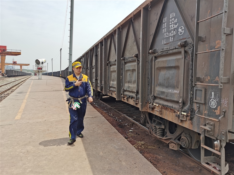 看着由远而近的一列重车,他气定神闲,做好“驯龙”准备,娴熟地跳上了一条“龙”身,“手握紧、腿蹬直、脚踩稳”,调车员这代代相传的“九字诀”他可是记得清清楚楚,只见他双手紧紧握住扶梯,身体紧紧贴住“龙身”,虽然从新站到下峪口站的距离只有短短几公里,但因为站内推进速度缓慢,高洋要保持这个动作30多分钟,即便是“驯龙高手”,一次车辆引导下来也很消耗体力。