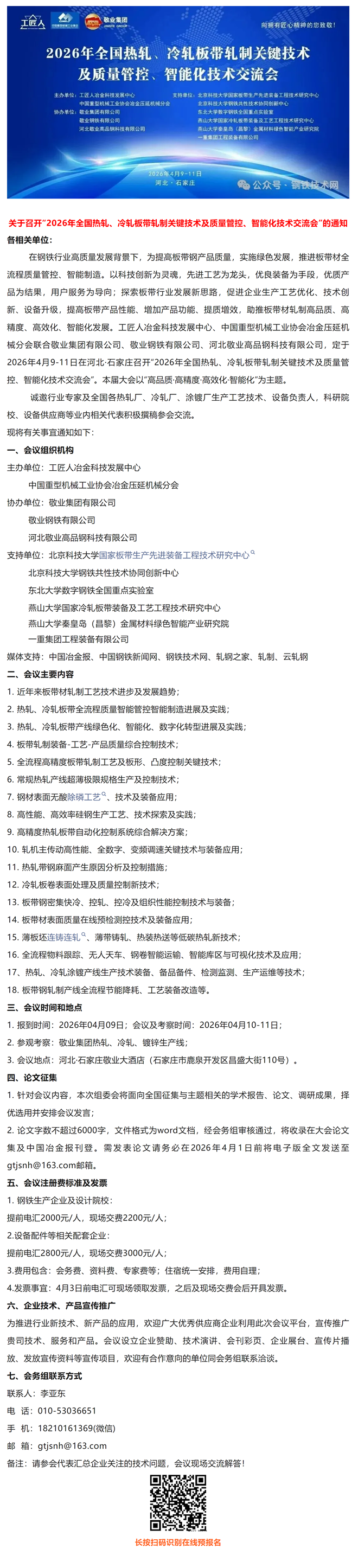 会议通知:2026年全国热轧、冷轧板带轧制大会,4月9-11日召开(敬业集团)